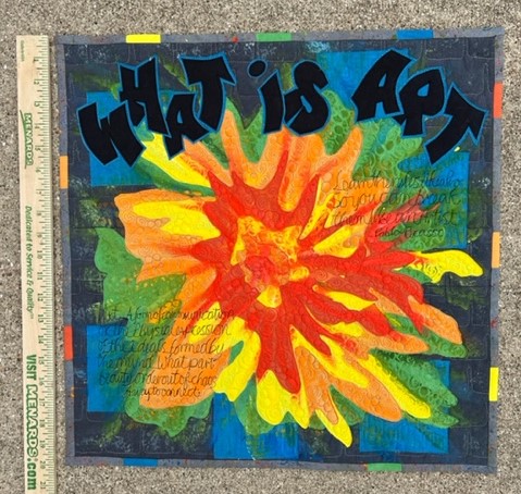 The Cherrywood Challenge this year was “Graffiti” so research included checking out all the local and world wall art projects, online examples, graffiti alphabets, and more. Since it couldn’t be political and by nature, graffiti is often “making a political statement”, it was a challenge! “What is Art”, the name of my entry, has always been a question so I free motion quilted definitions on top of the sunflower-like splats that had been quilted and then painted over. Lots of fun techniques on this! I love the vibrancy of the colors and the final design so am just waiting to see if the fabric company also likes it and wants it included in the touring show.