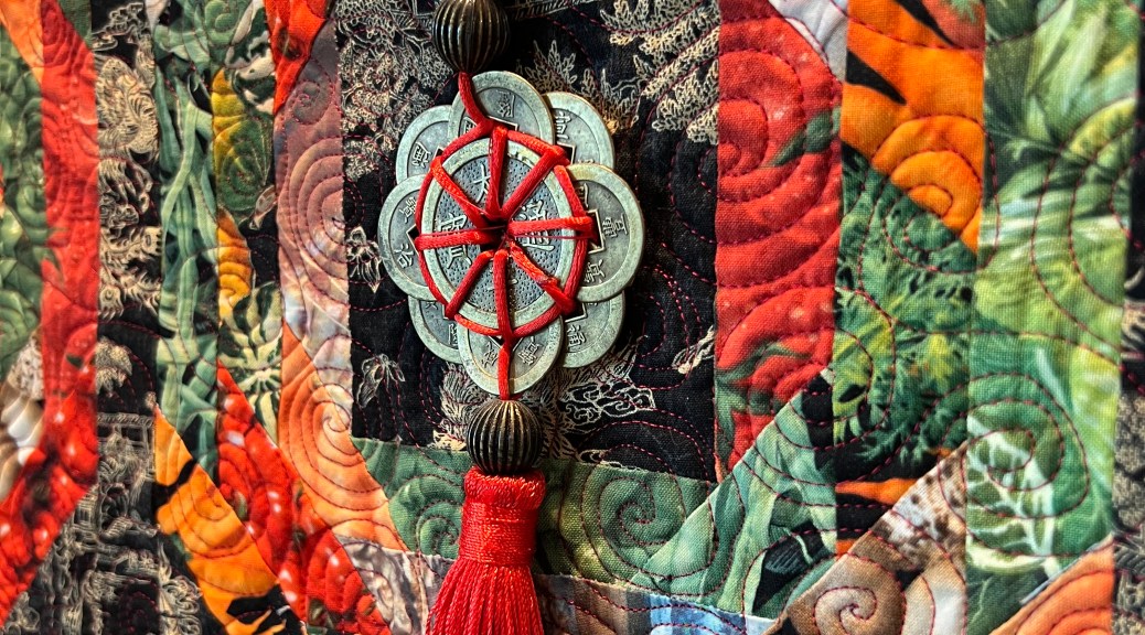 After spending months working on the writing and years creating the various quilts, I’ve finally put them into a book called “A Journey of 10,000 Stitches”. At this point, I’m waiting for the first copy to make sure it has no mistakes and then I can order copies and post it for publication and ordering on various venues. Stay tuned! It’s very exciting!! In a nutshell, it’s about expressing various journeys through fiber arts using fabrics, images, embellishments, assorted designs and more. Here’s the photo of the cover minus the lettering . . .