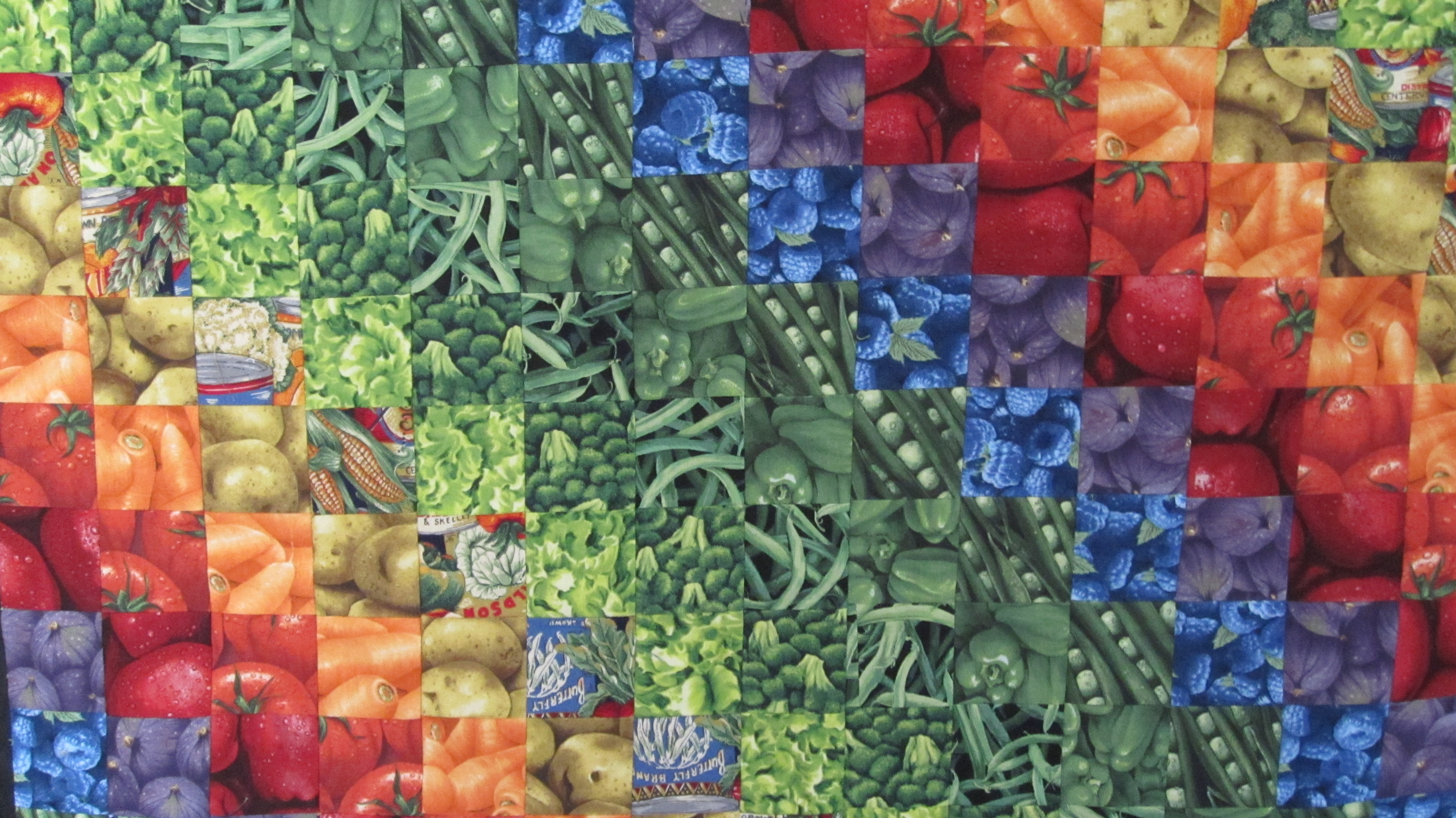 As an artist and registered dietitian, I have a right brain/left brain thing going on in my work. The fabrics that contain food images call me to buy them and put into something creative so this piece has a unique history. A photo was taken and submitted to the Journal of the American Dietetics Association contest for the cover and became “Miss April” in 2012. ‘Way cool to bridge two diverse fields of interest and really fun to see my work in print.