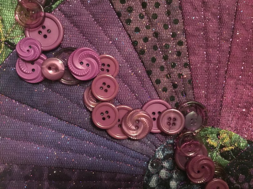 1. This reminded me of the grape harvest going on now in Ohio so I wanted to use a lot of purples and merlots along with buttons for our 2nd Monday art Quilters challenge this month.