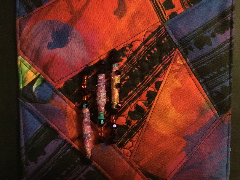 1. This crazy quilt design uses beads created from tyvek, painted and wrapped around a metal prong of a hotdog skewer. It was then heat treated, removed and wrapped with wire and small beads. Oo la la!
