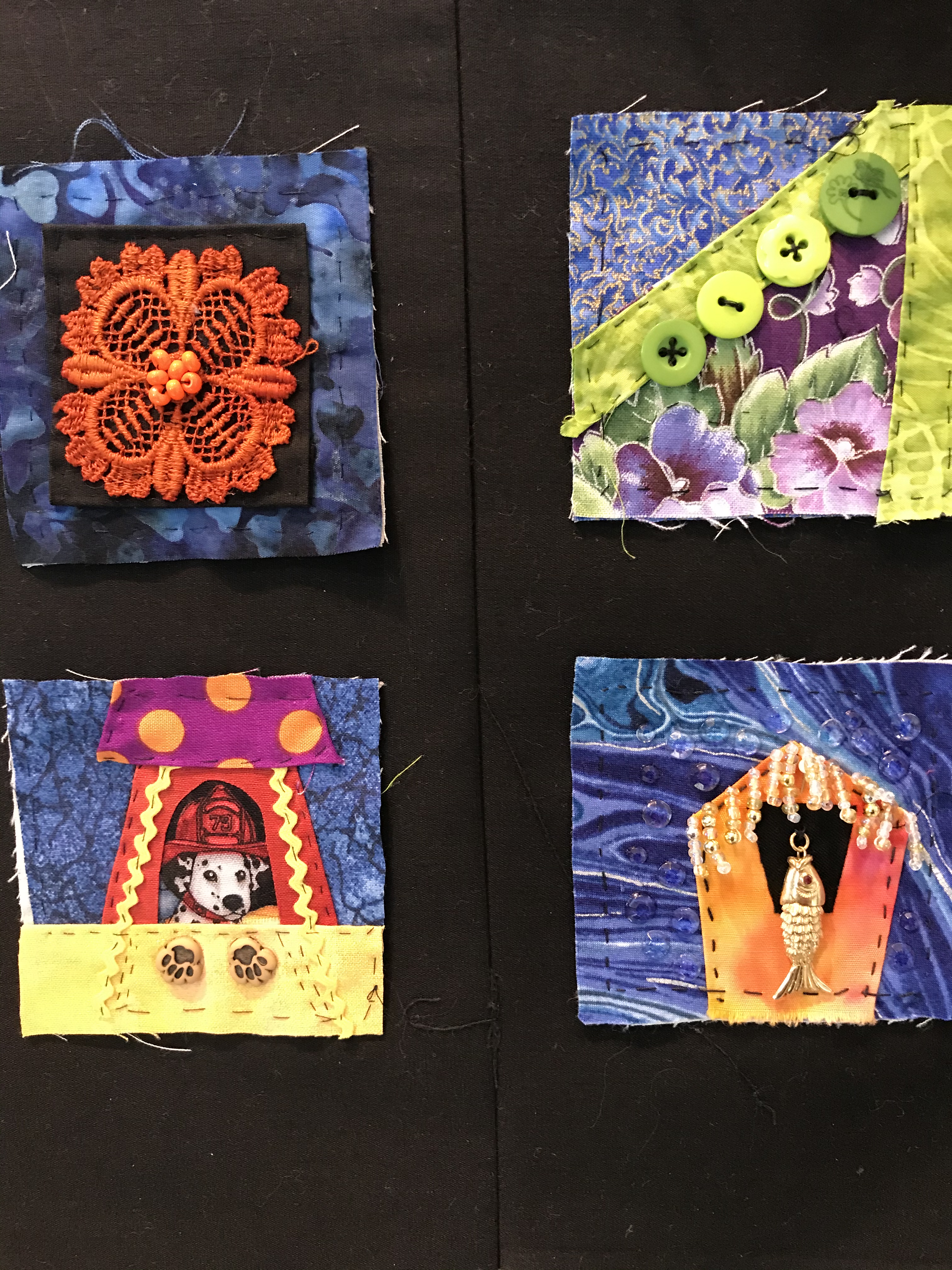 Have to admit that creating art quilts has consumed me these last months (along with kid and grandkids activities, helping to remodel our fixer upper, etc) so house cleaning has taken a second place. But, check out these really fun small gems! Created with fabrics and glitter netting, embellished with buttons and tyvek beads or flowers, these are attached to painted 8×8” canvas so much fun to create! Click on each piece and see my comments.